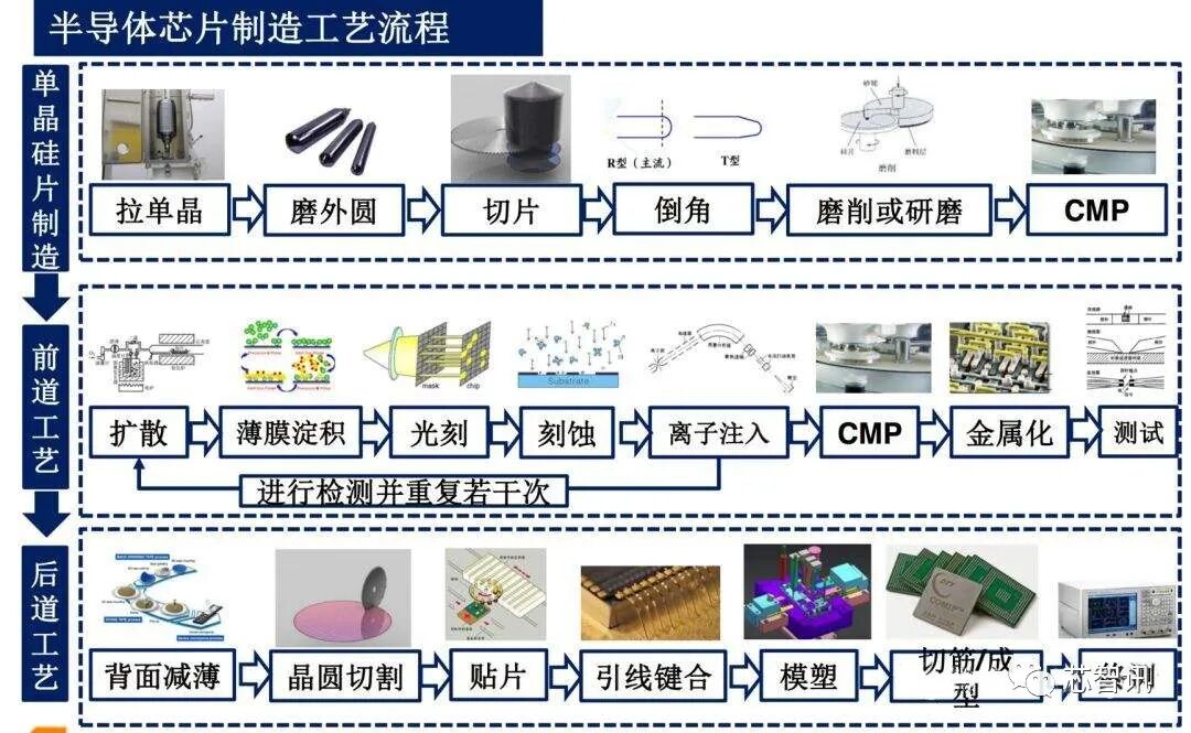 CMP 全称为 Chemical Mechanical Polishing,即化学机械抛光,是普通抛光技术的高端升级版本。集成电路制造过程好比建房子,每搭建一层楼层都需要让楼层足够水平齐整,才能在其上方继续搭建另一层楼,否则楼面就会高低不平,影响整体可靠性,而这个使楼层整体平整的技术在集成电路中制造中用的就是化学机械抛光技术。