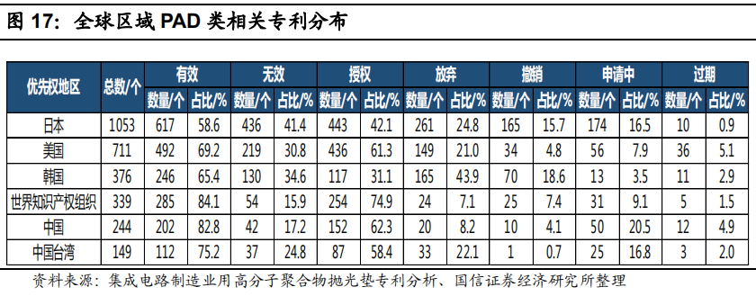 国产抛光垫最大的痛点之一在于专利技术积累较浅。日本、美国在抛光垫领域技术积累较厚实,中国排名第5。据《集成电路制造业用高分子聚合物抛光垫专利分析》一文统计,截至 2017 年,在全球 2918 个专利中,有效专利约 1511 个,而其中日本有效专利占比达 41%,美国有效专利占比达 33%,分别位居第一第二,中国近年来有所提升,有效专利数占比达16%。