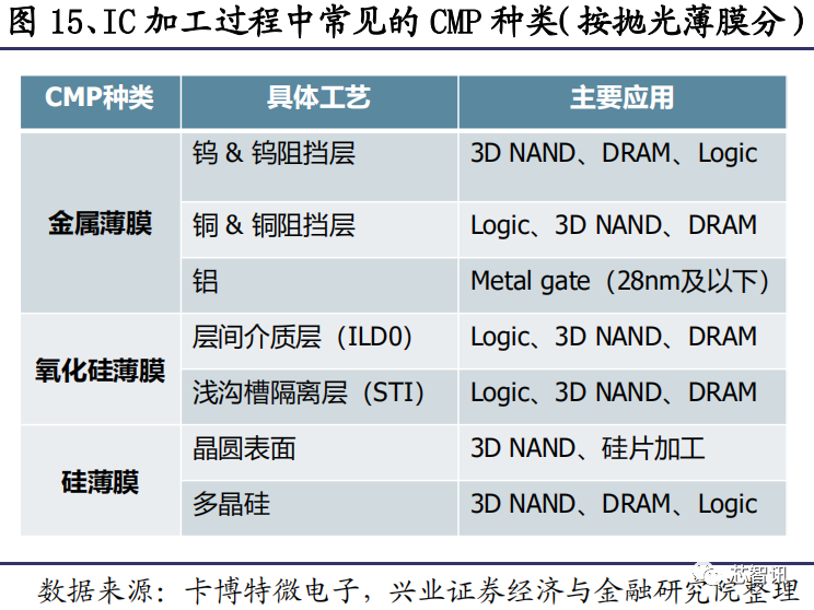 而根据抛光薄膜种类的不同,CMP 可以分为金属薄膜 CMP、氧化硅薄膜 CMP 和硅薄膜 CMP 等种类,且各自有侧重的主要应用领域。其中: