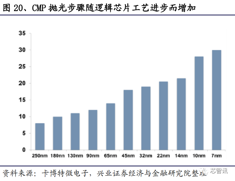 CMP 主要运用在在单晶硅片抛光及多层布线金属互连结构工艺中的层间平坦化。集成电路制造需要在单晶硅片上执行一系列的物理和化学操作,同时随着器件特征尺寸的缩小,需要更多的生产工序,其中 90nm 以下的制程生产工艺均在 400 个工序以上。就抛光工艺而言,不同制程的产品需要不同的抛光流程,28nm制程需要12~13次CMP,进入10nm制程后CMP次数将翻倍,达到25~30次。