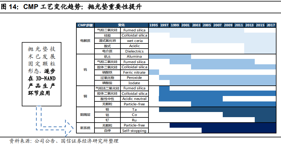 存储芯片从 2D NAND 向 3D NAND 的技术变革下,CMP 抛光步骤也近乎翻倍,从 8 步提升到了 16 步,进而大幅带动了 CMP抛光液的用量需求,其中又以钨抛光液为甚。