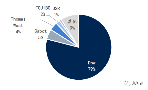 陶氏化学成立于 1897 年,经过一百多年的发展,目前已经成为了美国第一大、全球第二大化工企业。公司产品丰富、业务广泛,产品主要涵盖电子及特殊材料、涂料和基础设施、健康农业科学、特种系统、特种化学品、基础塑料、基础化学品、烃及能源八大领域,有 5000 多种产品,客户遍及全球 170 多个国家。陶氏在半导体材料领域主要经营 CMP 抛光垫、抛光液、光刻材料等,尤其在 CMP 抛光垫市场有着绝对的统治地位,全球市占率高达 79%。