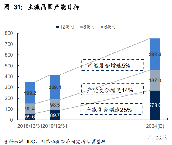 根据芯思想研究院统计,截止 2019 年底,我国12 英寸晶圆制造厂装机产能约 90 万片/月,较 2018 年增长 50%;8 英寸晶圆制造厂装机产能约 100 万片/月,较 2018 年增长10%;6 英寸晶圆制造厂装机产能约 230 万片/月,较 2018 年增长 15%。