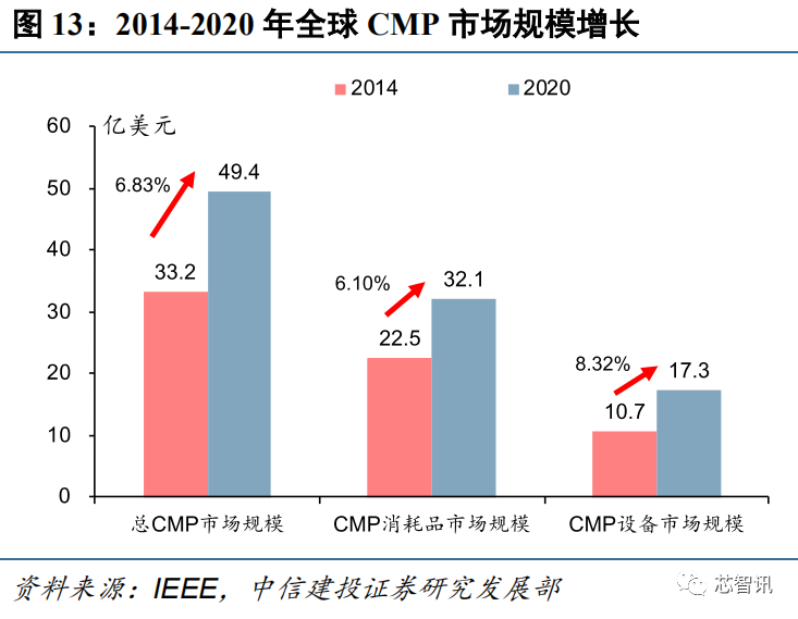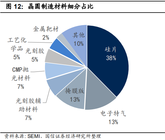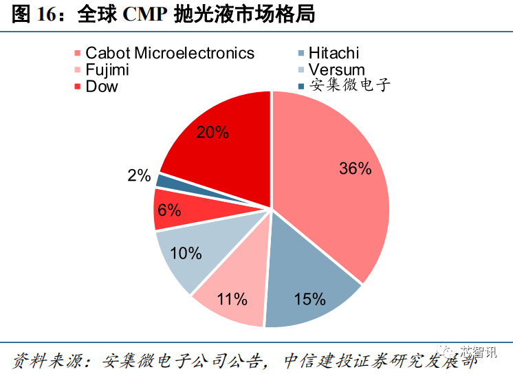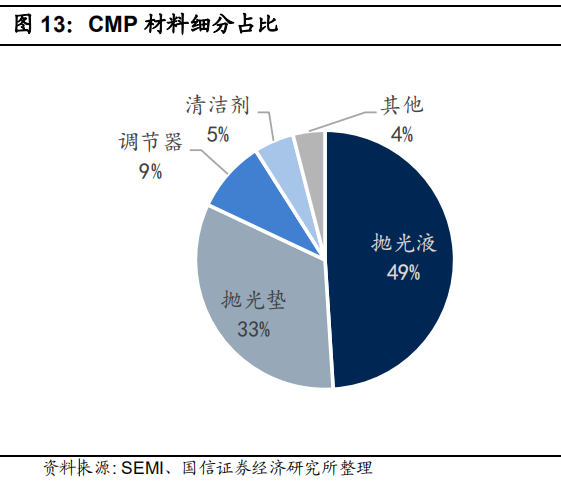 从价值量占比可以看到,CMP 材料是晶圆制造的核心耗材,占晶圆制造成本约7%,价值量与光刻胶相近。
