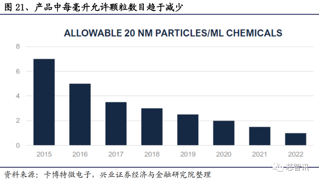 此外,制程节点的不断推进对于产品的纯度和污染控制也提出了更高的要求,体现为对更高纯度、低污染、低颗粒化学品的需求,据 Cabot Microelectronics 公开资料披露,产品对于无颗粒的要求逐年升级,其生产难度和价值量也随之升级。