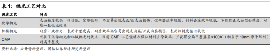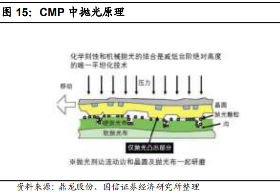 CMP 是通过纳米级粒子的物理研磨作用与抛光液的化学腐蚀作用的有机结合,对集成电路器件表面进行平滑处理,并使之高度平整的工艺技术。当前集成电路中主要是通过 CMP 工艺,对晶圆表面进行精度打磨,并可到达全局平整落差 100A°~1000A°(相当于原子级 10~100nm)超高平整度。