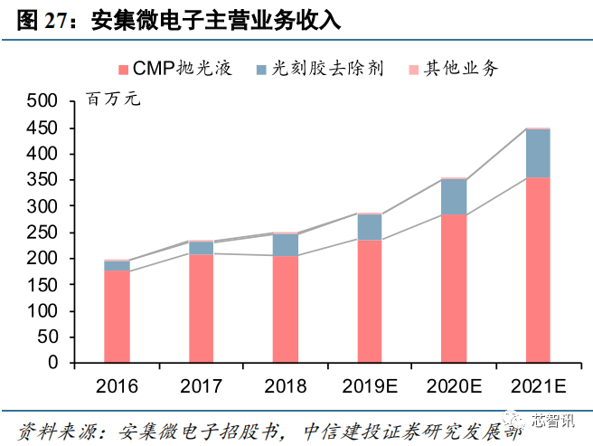 2019 财年,安集微电子营收 2.85 亿元,同比增长 15.15%;净利 7290 万元,同比增长 51.54%。我们预测安集微电子 20/21 年营收将达到 3.51/4.48 亿元,其中 CMP 抛光液营收 2.83/3.54 亿元,光刻胶营收 0.67/0.93 亿元。公司将保持 54%左右的毛利和 23%左右的增长率高速增长。