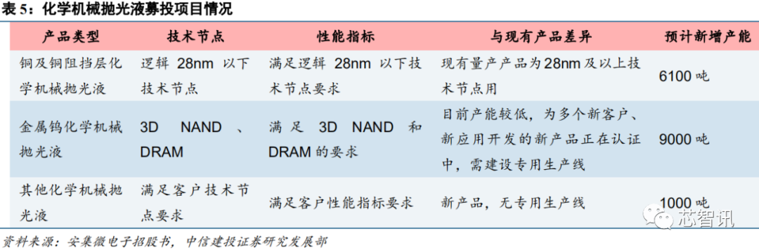 安集微电子正在积极扩建生产线,不断巩固市场地位,满足市场需求。公司“CMP 抛光液生产线扩建项目”募投 1.2 亿元,将用于扩建 CMP 抛光液生产系统和相应的厂务系统。项目将具体落实到铜及铜阻挡层抛光液28nm 以下技术节点产能,3D NAND、DRAM 的金属钨抛光液产能,以及其他化学机械抛光液的产能,预计新增产能分别为 6100 吨、9000 吨、1000 吨。