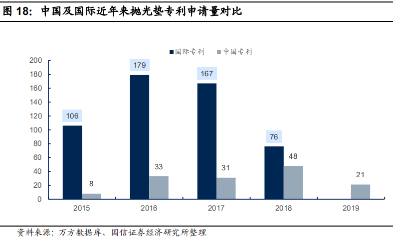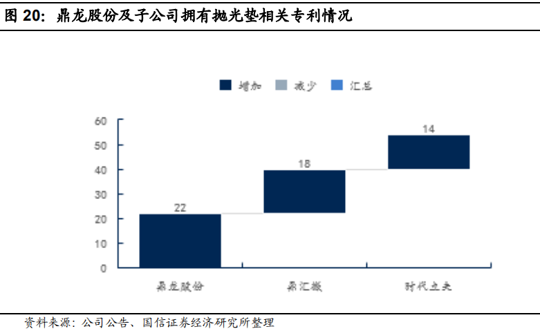 国内抛光垫领先企业鼎龙股份,2019 年共拥有专利 555 项,其中抛光垫制造及工艺相关发明及创新有效专利约 54 项,与海外企业具有一定差距。