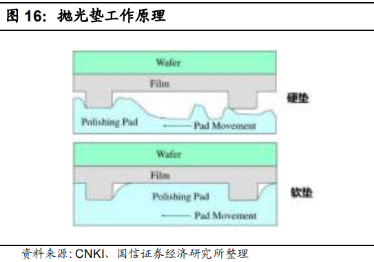 CMP是化学作用和机械作用相结合的组合技术,其工作原理是,旋转的晶圆以一定的压力压在旋转的抛光垫上做相对运动,借助纳米磨料的机械研磨作用与各类化学试剂的化学作用的高度有机结合来实现平坦化要求。这一过程中应用到的材料主要包括抛光液和抛光垫。