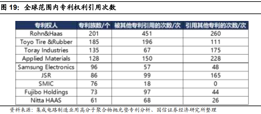 海外抛光垫龙头企业罗门哈斯(被陶氏收购)拥有较多和 CMP PAD 相关的高质量及基础专利。截止于 2017 年 9 月,通过代表专利质量指标的引用次数指标显现,罗门哈斯的专利被引用次数在全球范围内所有申请人中最多,达 451次,其总计拥有 201 个抛光垫的设计和制造方面的专利族,154 个抛光垫在抛光方面的应用专利,123 个抛光层方面的专利族,8 个抛光垫表面的专利族。