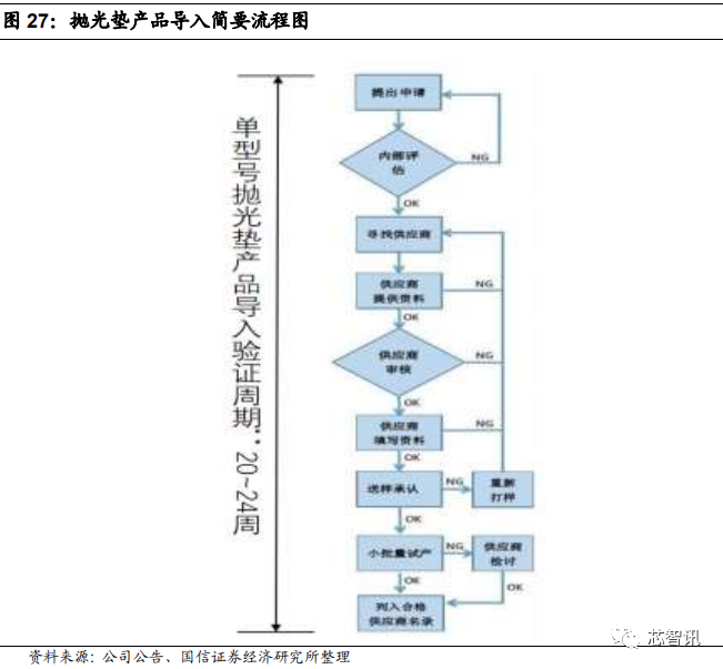核心客户认证体系壁垒较高,主要由于抛光垫对芯片良率影响较大,但成本占比较相对较低,在稳定而成熟的 FAB 厂中,为确保芯片良率,一般很少替换原有稳定的供应商。半导体 Fab 厂具有资本密集和技术密集的属性,对于上游半导体原材料的稳定性和良品率有极高的要求,因此对于原材料供应商认证门槛极高、认证周期较长。目前在半导体产业链安全可控的大环境下,国内厂商速度加快,验证周期缩短到半年左右。