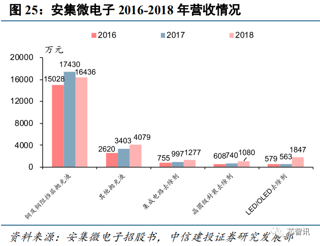 安集微电子成立于 2006 年,注册资本 4000万元,主营化学机械抛光液和光刻胶去除剂。2008 年切入中芯国际供应体系,逐步打开国内市场。2009-2010年,先后开拓华虹宏力、武汉新芯、华润微三家客户。2014 年安集微电子成功切入国际晶圆制造巨头台积电供应链,并于同年开始负责“高密度封装 TSV 抛光液和清洗液研发与产业化”国家“02 专项”。2015 年“02 专项”成功验收,并实现 130-28nm 技术节点规模销售。2016 年,安集微电子获得国家集成电路产业基金入股,并承接“CMP抛光液及配套材料技术平台和产品系列”国家“02 专项”,企业发展进入新阶段。2017 年后,公司推出钨系列抛光液,产品体系进一步丰富,并拓展了长江存储、士兰微等新客户。目前公司 CMP 抛光材料处于国内领先地位,全球抛光液市场份额为 2.4%,正在积极进行 28-14nm 产品的客户推广和 10-7nm 新技术节点的研发。