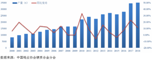 我国硬质合金行业起步较晚,但后续发展迅猛,从生产规模和市场容量来看,我国已是全球硬质合金第一生产大国和消费大国。2010~2018年行业呈波动上升趋势,年均复合增长率为 7.25%。2019年我国硬质合金产量达3.65万吨。市场规模在35亿美元左右。