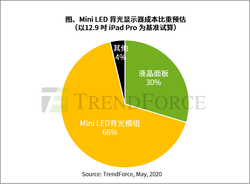 集邦咨询在最新《2020 Mini LED 次世代显示技术与供应链剖析》报告指出,从Mini LED背光的成本结构观察,由于2021年版的12.9吋iPad Pro预计会采用近10,000颗的Mini LED芯片作为背光源,因此仅是LED芯片、PCB背板、驱动IC等零组件成本就占了不少比重,再加上测试分选以及打件等制程,因此推估现阶段Mini LED背光显示器成本仍高于100美元,其中Mini LED背光模组成本就占六成以上。
