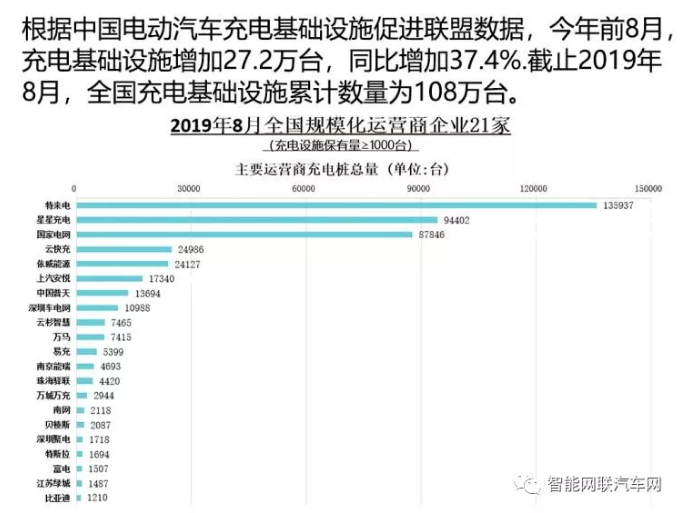 截至2019年10月,全国充电运营企业所运营充电桩数量超过1万个的仅有8家,8家运营商占总量的89.8%,其余的运营商占总量的10.2%。其中,特来电、星星充电和国家电网位居前三。