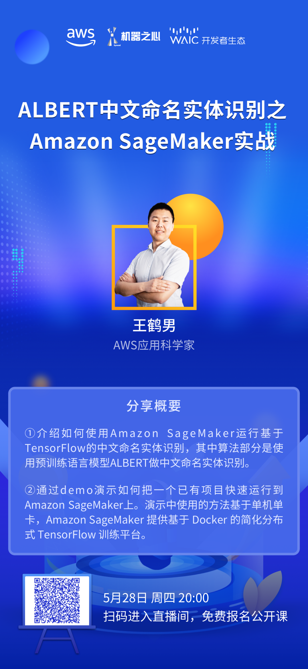 讲师简介:AWS应用科学家,在机器学习领域有多年工作经验,曾任神州优车集团人工智能实验室负责人,带领团队开发了车辆智能调度系统、金融反欺诈系统、身份证和人脸识别系统、高级驾驶辅助系统等基于机器学习的应用系统。曾任iHandy算法工程师,开发了短视频推荐系统、移动用户流失和付费意愿预测系统、掌纹和人脸识别系统等。课程概要:本课将介绍如何使用Amazon SageMaker运行基于TensorFlow的中文命名实体识别,其中算法部分是使用预训练语言模型ALBERT做中文命名实体识别,并通过现场演示,展示如何把一个已有项目快速运行到Amazon SageMaker上。本课程所演示的使用方法是基于单机单卡的,Amazon SageMaker 提供基于 Docker 的简化分布式 TensorFlow 训练平台。