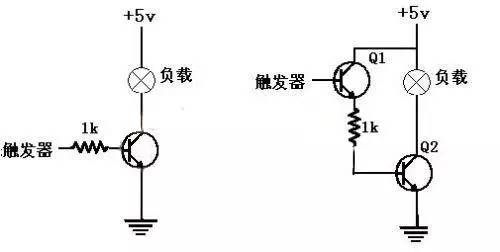 有时信号源(如正反器)输出电路之电流容量太小,不足以驱动晶体管开关,此时为避免信号源不胜负荷而产生误动作,便须采用图10(b) 所示的改良电路,当输出为高准位时,先驱动射极随耦晶体管Q1做电流放大后,