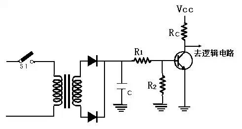 开关做为由高压输入控制低压逻辑的界面电路之实例,当输入部份的微动开关闭合时,降压变 压器便被导通,而使全波整流滤波电路送出低压的直流控制信号,此信号使三极管导通,此时集