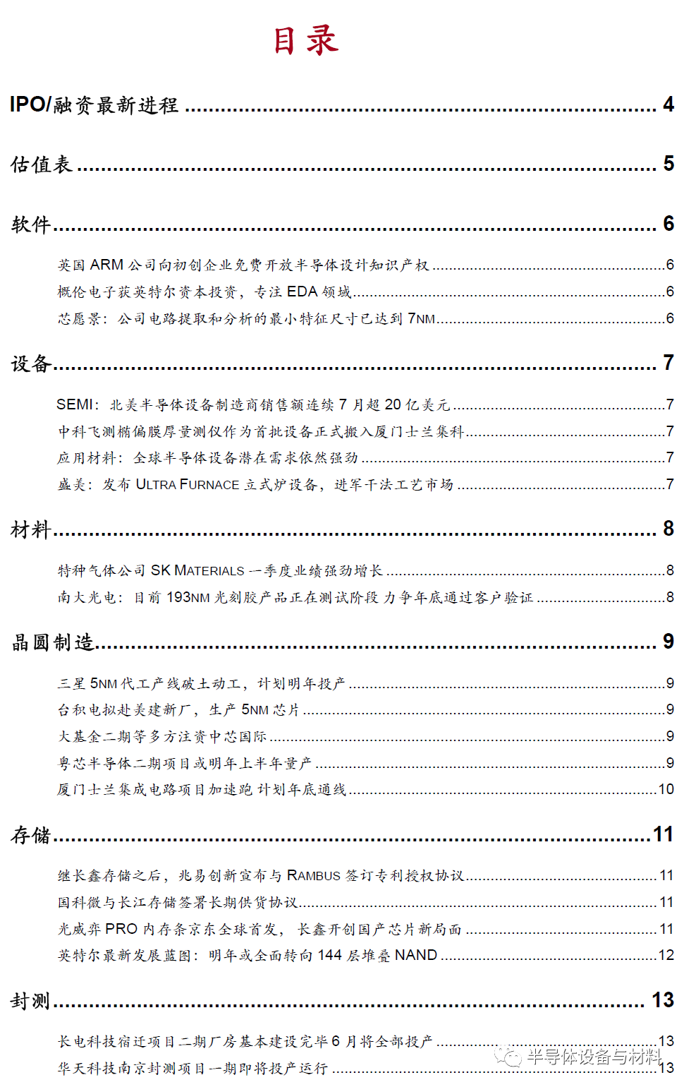 设备:对美依赖度接近50%,分工合作才能共赢。根据中国国际招标网,本土晶圆厂对美设备依赖度达到47%,离子注入机、量测设备、高深宽比刻蚀设备、SOC测试机等仍主要从美国进口。应用材料公布新一季度业绩,收入环比下降但订单仍强劲,与之前ASML、Lam Research整体前瞻性展望和TSMC、SMIC对先进制程的战略性投资观点一致。盛美半导体推出三款半关键清洗系列设备及Ultra Furnace立式炉,打开成长空间。目前半导体设备拟科创板IPO标的包括盛美半导体、华海清科、联动科技。