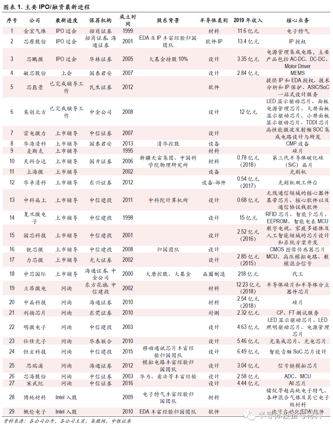 设计:思瑞浦、芯海股份、中科晶上等冲刺科创板。目前正在申请科创板的芯片设计企业,包括思瑞浦(信号)、芯海股份(ADC)、中科晶上(基带芯片)、芯朋微(电源管理芯片,IPO已过会)、恒玄科技(智能音频SOC芯片)、集创北方(LED显示驱动、面板电源管理芯片)等。