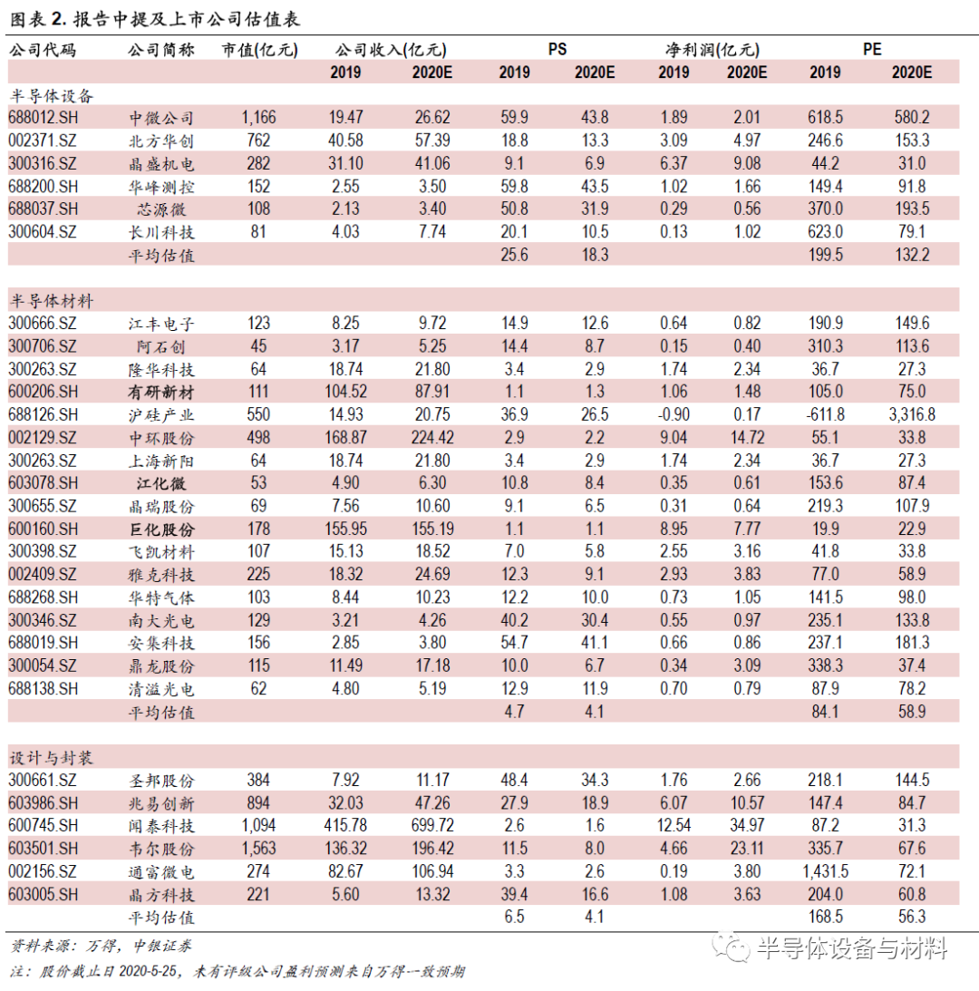 材料:对日美依赖度高,国产化率低。半导体材料主要被日、美垄断,包括大硅片(日本信越、Sumco)、掩膜版(日本DNP、Toppan、美国Photronics)、光刻胶(日本JSR、东京应化、富士电子材料)、溅射材料(日矿金属、日本东曹、住友化学等)。SK Materials公布一季度财报收入增长15%,其中NF3同比下降10%,WF6同比增长2%,硅族气体/刻蚀气体同比增长6%,前驱体同比增长2%。目前半导体材料拟科创板IPO标的包括麦斯克(硅片)、天科合达(SiC晶片)、上海合晶(硅片)、立昂微(硅片及分立器件)、金宏气体(电子特气,IPO已过会),而博纯材料获Intel投资。
