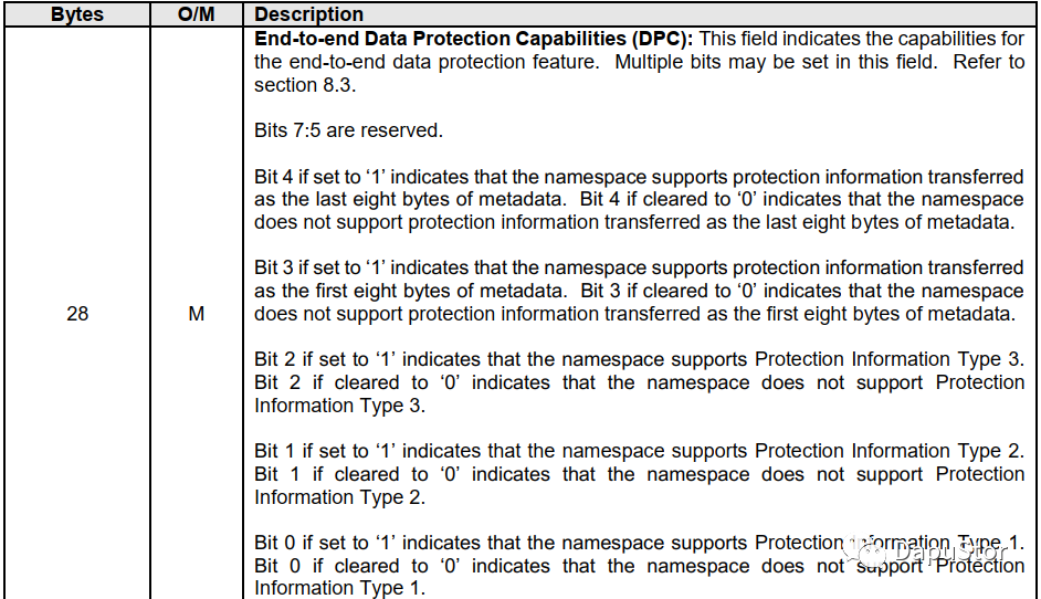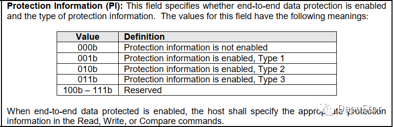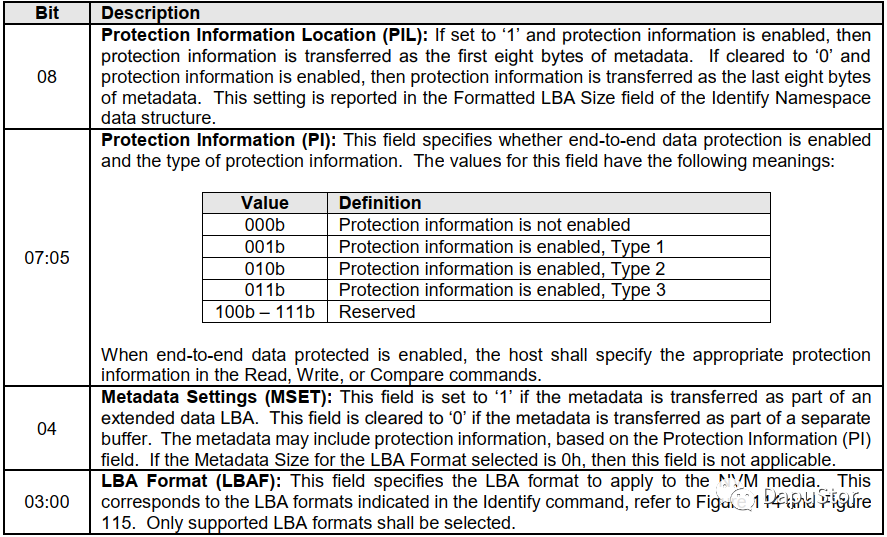 首先通过identity CNS=0,获取到SSD支持的PI类型,以及支持的数据传输类型。如果MC的bit0为1则指出DIF,DPC的低3Bits为1分别表示支持type1,2,3。确定SSD支持DIF之后再选择一个MS大于等于8的LBAF。