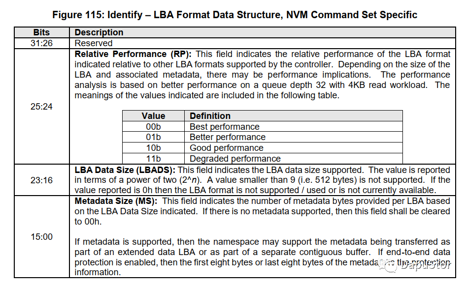 LBAF:则是指定的数据格式,包括lba的大小以及metadata的大小。