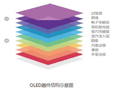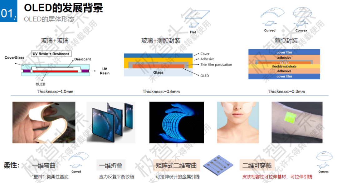 有机发光二极管(Organic Light-Emitting Diode,OLED),是利用有机半导体材料在电场作用下发光的技术。由于有机发光各层材料及器件制备特性,OLED器件为多层二维面型结极。OLED器件每层材料层的厚度极薄(一般小于500nm),因此OLED器件可以制作的非常轻薄,OLED产品形态取决于基板的形态,采取不同基板,OLED可实现透明、弯曲、卷折等特殊形态。