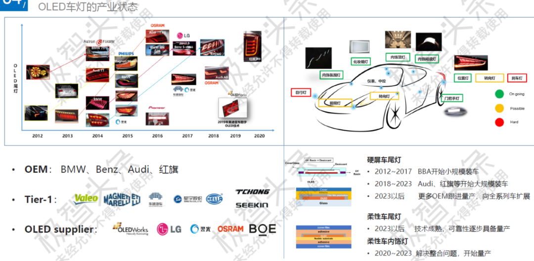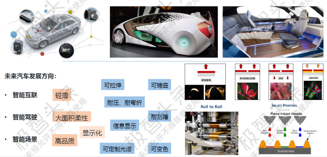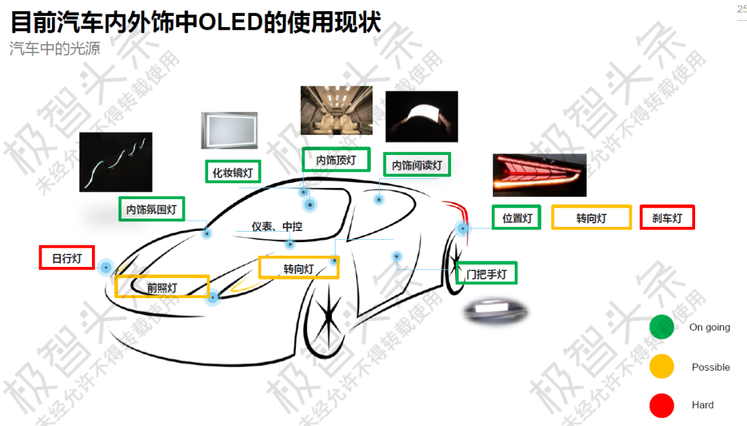 OLED在汽车内外饰中均有应用。报告详细分享了目前汽车内外饰中OLED的使用现状以及技术进展,其中,车载产品需要更高的可靠性,许显斌也表示, OLED产品进入车载领域,最大的困难是高可靠性要求。
