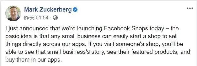 “我们从今天开始正式上线Facebook Shops(电商)功能,此举是为了让更多中小企业可以通过Facebook平台搭建属于自己的商铺,并借此直接向平台上的用户卖货。”