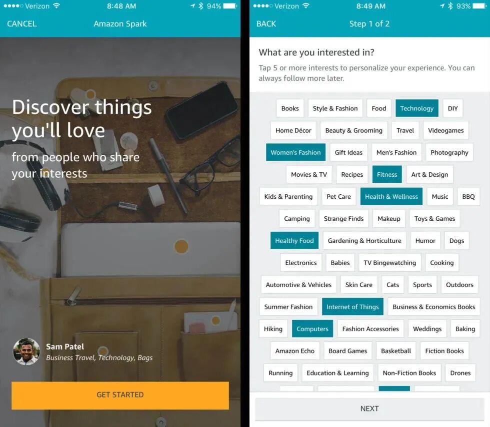 2017年初,亚马逊推出了第一款社交产品Spark,它的产品界面与Instagram和Pinterest两款成熟的社交产品有些相似,用户以图片流的方式来分享好物,而新用户需要至少选择五个感兴趣的领域,系统将以此为标签定向推送相关内容。