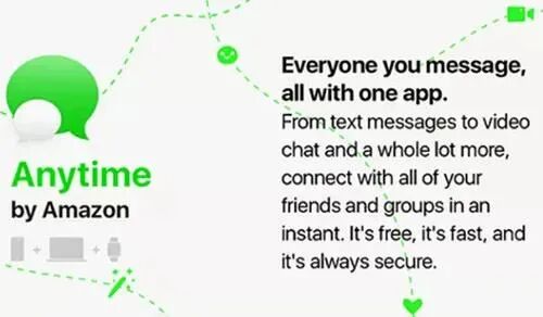 2017年7月,外媒曝出亚马逊在秘密开发一款名为“Anytime”的社交通讯产品,将在移动端和PC端同时上线。除了常规的文字聊天、视频通话、发送多媒体文件等基本功能之外,Anytime还支持为发送的图片加滤镜、玩小游戏、对接第三方企业服务等功能,而亚马逊自身的电商及影视音服务,也都整合在了Anytime中。