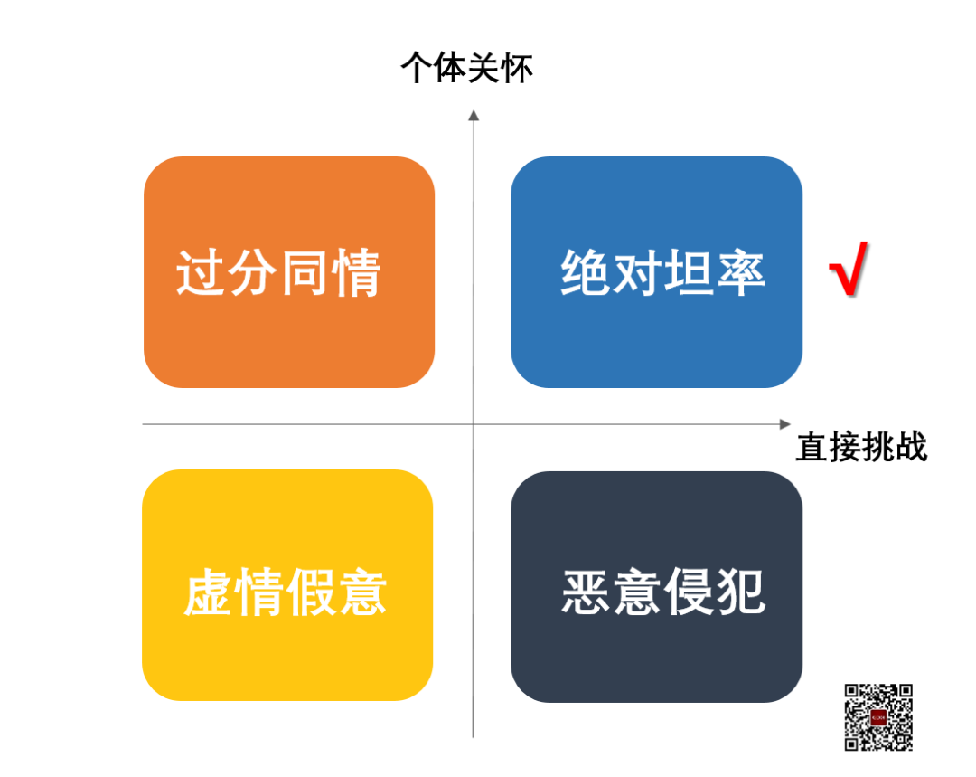 上图展示的这4个象限,代表着领导与下属沟通的四种方式:第一象限是作者期望的”绝对坦率”的正确做法,即对于下属真诚的关心,并在下属出现问题时直截了当的说出自己的想法。