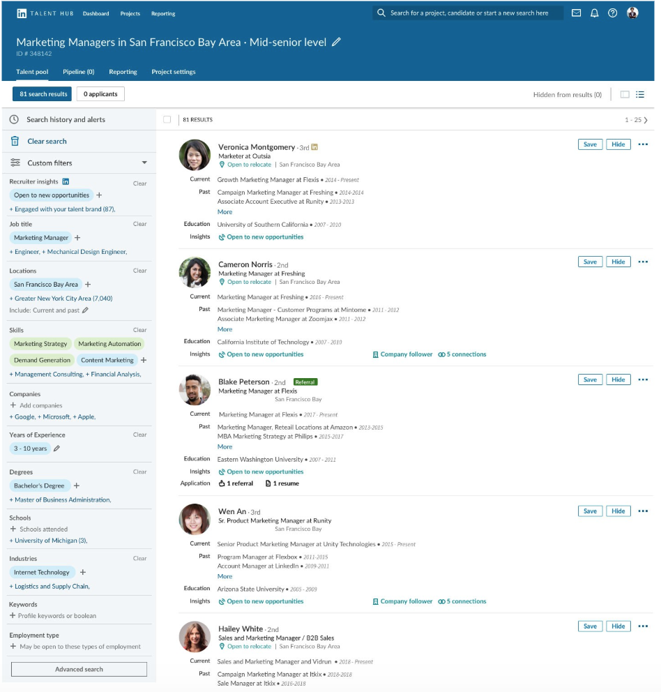 面向招聘者,领英提供了多种「人才搜索与推荐」方面的产品。比如 LinkedIn Recruiter,它会根据使用者的反馈,更主动、有针对性地为招聘的职位推荐候选人。传统的搜索和推荐系统一般只关注搜索内容和查询关键词的相关性,但这里的人才搜索功能还需要满足一点,就是招聘人员和候选人在相关领域互相对彼此感兴趣。经过此类筛选后,不仅应聘者需要与招聘者的工作需求相契合,并且招聘者联系的求职者也必定对岗位机会感兴趣,从而提高双方的匹配成功率。