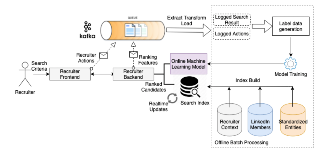LinkedIn Recruiter 产品截图(模拟)。面向求职者的「职位推荐」也是领英的主打产品之一。用户在领英上传个人简历,平台会推荐适合求职者的工作。目前很多求职招聘平台都会提供这种功能,但如何做出精准高效的个性化推荐,至关重要。领英做的第一步是建立知识图谱和研发针对自然语言的标准化技术,并针对每位用户的简历,使用基于深度学习模型的标准化技术来实现信息抓取,比如 LSTM、CNN 等等。为了实现个性化服务,领英采用了能够从多角度理解内容的机器学习算法,通过将机器学习与会员意图信号、档案数据和会员人脉网络信息结合起来,实现会员推荐和搜索结果的高度个性化。此外,为了提升应聘者和企业的使用感受和招聘效率,在候选人沟通和面试方面,领英也提供了两种新功能:一是旨在提升应聘者面试表现的「Interview Prep」,它会提供人工智能即时答案反馈的功能。这项功能可以根据求职者以往有记录的回答,为他们提供其中一些比较常见面试问题的即时反馈。 二是旨在提升企业对应聘者软实力考察效率的「视频介绍功能」,它能帮助招聘者邀请应聘者,通过以短视频或者笔试的形式回答 1-2 个问题,去展示应聘者的交流技能和其他软技能。这个功能目前处于测试阶段。据统计,自从「可能感兴趣职位」的个性化人工智能服务上线后,职位申请数量增长了 30%。在领英中国团队将该模型在中国用户后,职位申请的数量又额外提高了 11%。在人工智能驱动的产品优化之后,职位申请量实现了 40% 的年度增长。通过利用人工智能改进的招聘解决方案,站内信回复率提高了 45%,同时也减少了领英向会员发送通知的数量。在这些面对 6 亿多用户的人工智能服务背后,领英是在利用哪些技术作为支撑?领英用来训练算法的技术称为「Online Learning」,这也是一种在工业界应用十分广泛的机器学习算法。基于招聘者与候选人的互动方式,领英的算法会在招聘过程中持续学习招聘者的偏好,并提供与需求更加贴合的候选人。这种在线学习驱动的推荐系统利用工作描述、招聘者接触过的或存档的候选人,以及对这份工作感兴趣的求职者等多维信息,综合计算,主要应用于为公开招聘职位匹配最佳候选人。举个例子,如果招聘者一直对「具有领导技能的会计师」或「擅长社交媒体的项目经理」等类别的候选人感兴趣,领英就会推荐更多类似的候选人,潜移默化地学习和推测对招聘者当前人才需求和意图。所有过程实时在网络上计算进行,求职市场的反馈变化一旦发生,就会被立即学习。在新功能 Recommended Matches 中,领英基于用户的隐身求职状态(Open Candidate)和其他潜在的求职指标(例如,技能、头衔、行业和资历),在系统中按照竞争力的强弱展示出这些求职者。领英的算法会根据候选人是否符合求职标准、是否表现出求职意向以及是否对招聘者的工作感兴趣,计算出最有可能接受工作的候选人。代表性结果(Representative result)当然,在候选人筛查方面还存在一个「公平问题」。由机器学习模型计算出的求职者排序可能无意中产生偏见,进一步减少弱势群体的竞争力。在领英看来,合格的候选人和人才搜索功能中排名靠前的候选人,他们对工作的兴趣的类型分布应该大致相同。这意味着,在搜索中排名靠前的人才在更广泛多样化的能力层面上需要更具“代表性”(Representative)。因此,领英采取了具有代表性的人才搜索系统的技术架构,通过机器学习模型检索的候选集进行重新排序,向招聘人员展示一组与工作需求相符合的潜在候选人,以确保减轻偏见,获得多样化的人才。对于招聘方来说,人才搜索与推荐系统的设计非常重要。领英在 Lucene 上建立了一个名为 Galene 的搜索堆栈,并搭建了各种插件,包括实时更新搜索索引的功能。搜索索引由两种类型的字段组成:这些搜索索引字段有助于在搜索排名中评估机器学习的特征价值(Feature Values)。搜索索引字段中数据的新鲜度(Freshness)对于机器学习特征也非常重要。