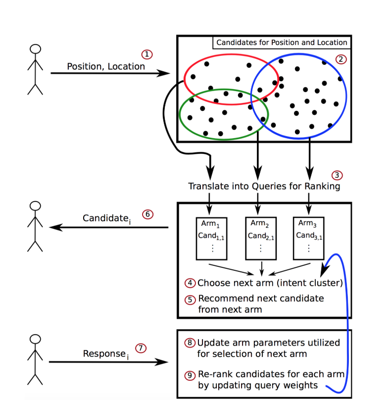 Galene Broker 系统将搜索查询请求分发给多个搜索索引分区。每个分区检索匹配的文档,并将机器学习模型应用于检索到的候选人。每个分区(即单一的能力指标)对候选人的子集进行排序,然后代理系统收集排序后的候选人,并将它们返回给 Search Federator,这是 L1 层架构。在 L2 层,Search Federator 会进一步根据额外的动态或从缓存信息中引用的排名特征,对检索到的候选人进行排名。但如何根据招聘人员所寻找应聘者的类型,来模拟其意图和偏好,一直是人工智能在招聘领域应用中的挑战。此前,领英尝试过两种方法:通过领英所存储的招聘人员使用数据,进行离线学习个性化模型来实现;或者通过收集了解招聘人员在线使用时的偏好来实现。离线学习模型的一个不足是,招聘人员在线实时检查推荐的候选人并提供反馈时,其最新偏好和意图不能在正在进行的搜索会话中得到实时的反应和反馈。因此,LinkedIn Recruiter 团队根据用户反馈建立了更加贴合需求的系统,并根据各种条件(如,每一次应聘中给候选人提供的即时反馈)进行多步骤运算后,推荐该职位的最佳候选人。下面是领英用于这种系统的架构,它首先将潜在的候选人按照技能分成几组。然后,基于招聘人员的当前意图,利用 Multi-Armed Bandit 模型来分析出哪个组别更理想的适应工作需求,并且基于招聘者的反馈来更新每个技能组内的候选人排名。