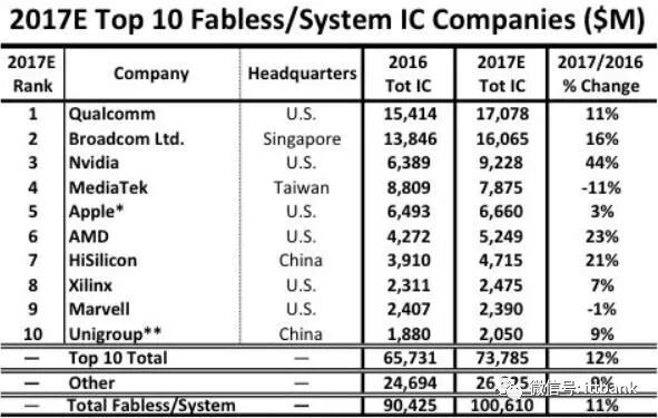 2017 年全球前十大Fables s IC 设计厂商(百万美元)然而,尽管大陆地区海思和紫光上榜,但可以看到的是,高通、博通和美满电子在中国区营收占比达50%以上,国内高端 IC 设计能力严重不足。可以看出,国内对于美国公司在核心芯片设计领域的依赖程度较高。