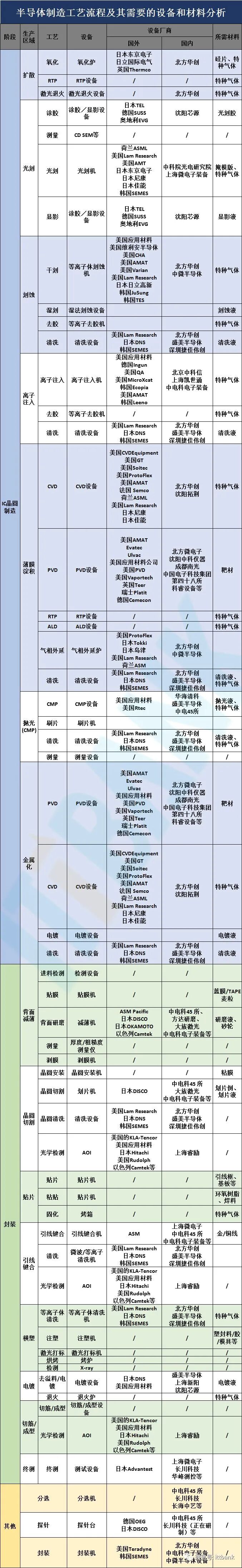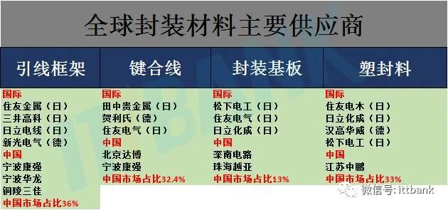 日美德在全球半导体材料供应上占主导地位。各细分领域主要玩家有:硅片——Shin-Etsu、Sumco,光刻胶——TOK、Shipley,电子气体——Air Liquid、Praxair,CMP——DOW、3M,引线架构——住友金属,键合线——田中贵金属、封装基板——松下电工,塑封料——住友电木。