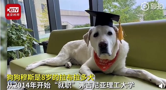 近日,美国弗吉尼亚理工大学兽医学院在线毕业典礼迎来了一名特殊的毕业生:一条名叫穆斯的8岁拉布拉多寻回犬,获得了兽医专业荣誉博士学位。