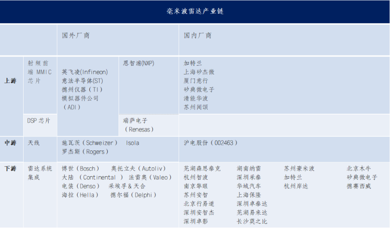 比如海归派:森思泰克、杭州智波;科研派:行易道、南京隼眼、苏州安智、苏州豪米波;实业转型派:深圳安智杰、德赛西威、雷博泰克等。