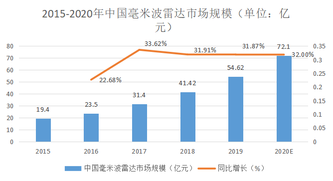 自2017年交通运输部发布《营运客车安全达标实车核查工作规范》,中国毫米波雷达产业得到了长足的发展。2015至2020年,中国毫米波雷达行业的市场规模保持上涨趋势,且增速保持较快。其中,2017至2020年年复合增长率达31.9%。2019年中国毫米波雷达行业市场规模为54亿元。预计2020年我国毫米波雷达行业市场规模将达到72亿。