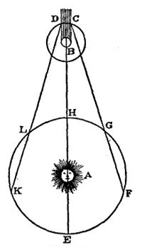 大约在17世纪的70年代,来自丹麦的勒麦和来自巴黎的让·皮卡特从木卫食中窥探出一丝端倪:在一年的时间内,木星的卫星在各自的轨道上运行的时间是不同的,当木星和地球之间的距离变大时,运转时间大于平均值。勒麦认为实际的运动导致这种不均匀性的可能性非常小,坚信光的传播具有一定的速度。勒麦向法国科学院解释了他的理论并且计算出光穿过地球的时间大约为22分钟,当然,今天用准确的光速计算得到的结果为16分36秒。勒麦的光速测定法的基本原理如下图所示,地球从L转动到K时,第一个木卫食出现的时间比从平均运转周期中计算出的时间迟几分钟,勒麦认为这是由于额外增加的行程多费了时间;当地球从F运转到G时,木卫食出现的时间比平均值要小,勒麦认为这是由于光线少走的行程引起的。