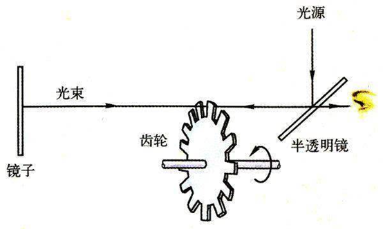 年老的阿拉哥视力较差,这样工作只能由更年轻的人来完成,法国物理学家阿曼达·菲索和莱昂·傅科就是其中的佼佼者。1849年,菲索利用光源照射到距离8633米的反光镜上,光线经过720个规则挡光齿轮旋转遮光,通过计算遮光的次数得到1秒钟内光行进的距离。每秒31.5万公里,这已经与现在的数值相当接近了,毫无疑问齿轮的遮光宽度影响了测量的精度,但这种方法仍然可以看作伽利略方法的延续。