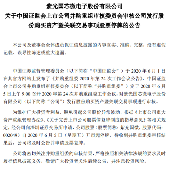 15、紫光国微重组事项上会6月5日停牌