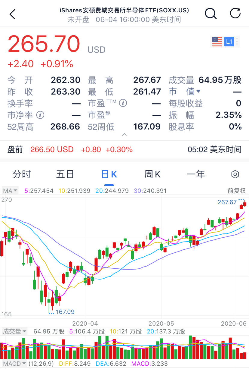 腾讯自选股数据显示,6月4日美股半导体指数ETF(SOXX.US)收盘价格为265.70美元,涨幅为0.91%,总成交量达64.95万股。