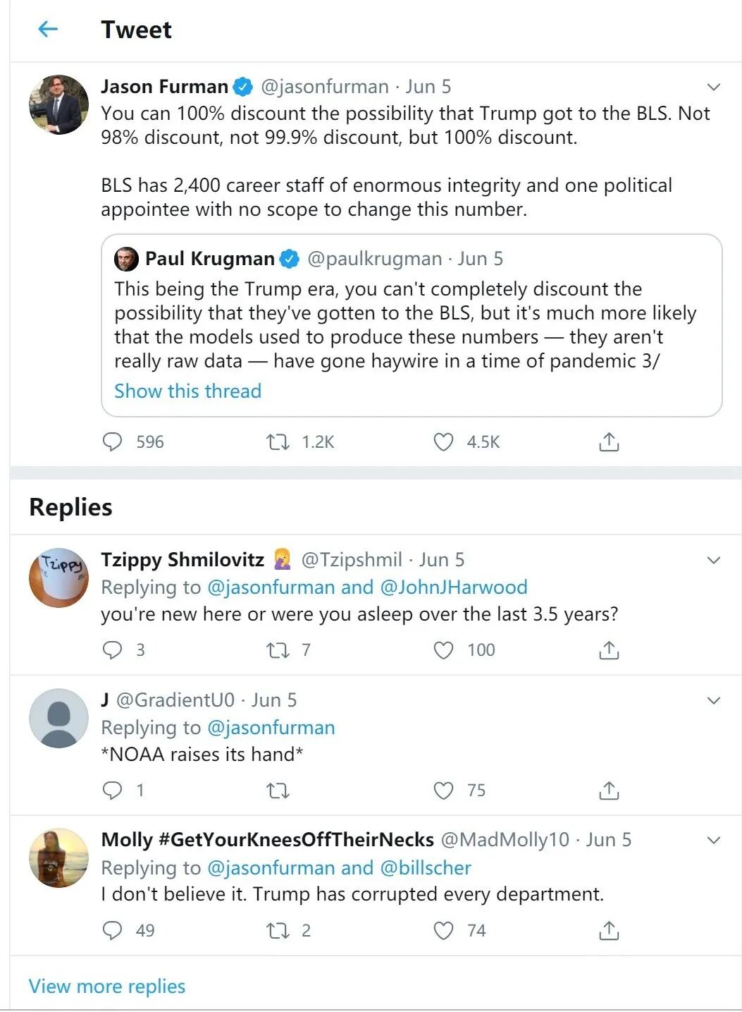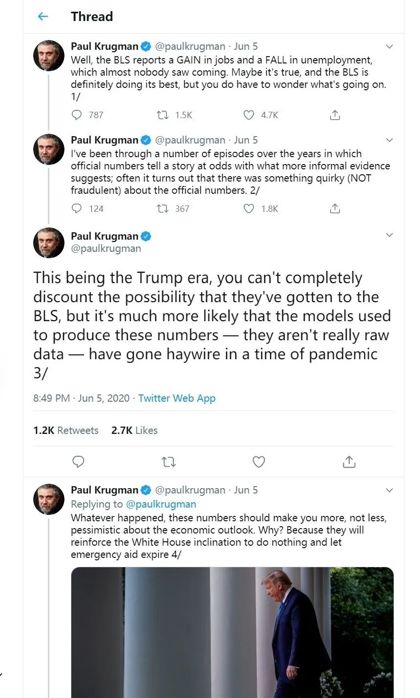 我们可以相信美国劳工统计局2400名职员的操守与专业水准,问题是我们能相信特朗普吗?疫情爆发以来,美国医学专家安东尼福奇(Anthony Fauci)多次提出的专业意见,都被特朗普政府无视甚至践踏了,美国疫情死亡人数超10万,至少一半功劳应该记在特朗普名下吧?所以我更同意保罗·克鲁格曼对数字的质疑。
