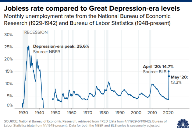 第四,经“选择”的数字进一步引爆市场。美国劳工统计局的这份报告几乎“砸”了所有经济专家的饭碗,在该数字公布之前,市场普遍预期失业率为20%甚至以上,但该局给出的5月份失业率为13.3%!这个数字一公布,经济学家们都癫狂了,克里斯·罗普基(Chris Rupkey)在公开信中说,这是“我们一生中最大的预测失误”。BLS公布的数字让经济学家分裂,有人质疑数字造假,有人为BLS找理由,相关的分析汗牛充栋,感兴趣的读者可以自行搜索,这里不多赘述。但是这个数字公布不久,BLS又出了一个声明打补丁,说由于采集数据“分类”错误,实际失业率大约为16.3%,即差了3个点。
