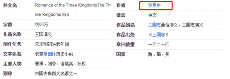 超链接关联是 Topbase 进行关联和推理的第一步,它是利用网页中存在的超链接对知识图谱中的实体进行关联,如百科“三国演义”页面中,其“作者”属性链接到“罗贯中”的百科页面(如图 24 所示),基于这种超链接的跳转关系,可以在 Topbase 的实体之间建立起一条边关系,如该示列会在实体“三国演义”与“罗贯中”之间生成一条“作者”关系,而“曹操”并没有该超链接,所以三国演义的主要人物属性中的字符串“曹操”不会关联到具体的实体页面中。在进行超链接关联之前,Topbase 中的实体是一个个孤立的个体,超链接关联为知识图谱补充了第一批边关系,但是超链接关联无法保证链接的覆盖率。