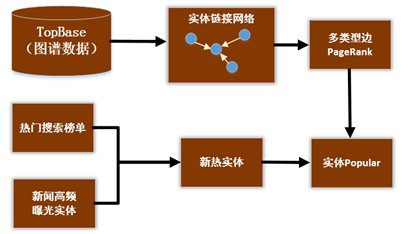 新热实体的含义为最新出现的热门实体。这类实体需要较高的 popularity 值。但由于是新近出现的实体,其与其它实体的链接关系非常匮乏,因此无法通过基于实体链接关系的这类方法来计算。对此我们采取的方案侧重于对新热实体的发现,然后对发现的新热实体的 popularity 进行调整,使其 popularity 值在同名实体中处于最高的位置。新热实体的发现目前基于两类方法:一类方法发现的热门实体可以直接对应到知识库中的某个实体,另一个方法只能发现热门的实体名,需要通过一些对齐方法与知识库中的某个实体关联起来。